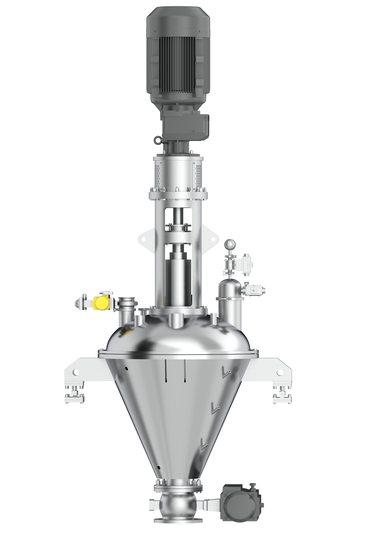 随后,物料在重力作用下回落至腔体底部,并在下落过程中再次经过高速桨叶区域,接受二次混合与精细化分散,最终物料经多次混合过程达到客户所需混合产品。